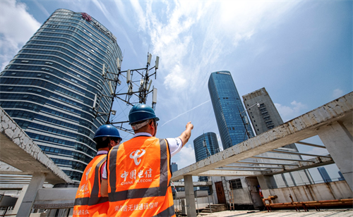 (中国电信网络工程师正在5G基站施工现场)