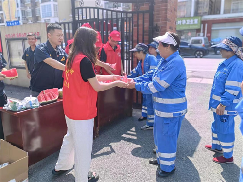 活动现场,社区工作人员和黑猫集团肥业直属党支部党员把西瓜、防暑降温包送到一线户外工作人员的手中,对他们不畏高温酷暑、坚守岗位、甘于奉献的劳动精神表示赞扬和感谢。并叮嘱户外工作者们要劳逸结合,注意高温避暑,合理安排休息时间,既要做好日常工作,也要加强安全防护措施,保护好自己的身体。
