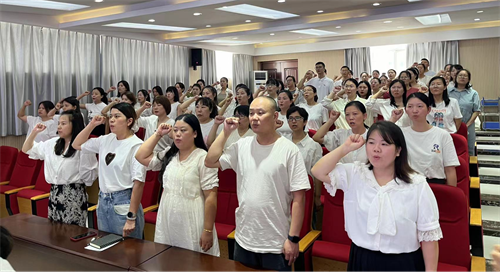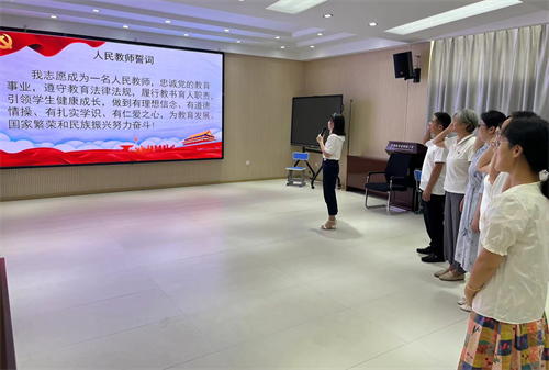 全体教师在全市模范教师、校工会主席汪娜地带领下,老师们高举右拳,庄严宣誓。
