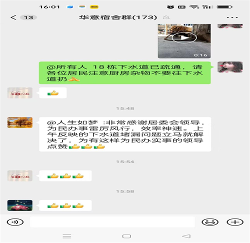 周四说事,一直是吕蒙街道官庄社区倾听居民心声,解决群众实际需求的重要平台。9月6日,华意宿舍小区居民在网格群里反映化粪池堵塞影响出行的问题,得到了高效的解决。