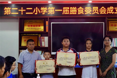 总务主任韩璐宣读第二十二小学膳食委员会产生过程及名单,由学校领导班子为膳食委员会的成员颁发聘书,并明确了膳食委员会成员职责,同时表达了对各位成员积极为学校管理工作建言献策的感谢。