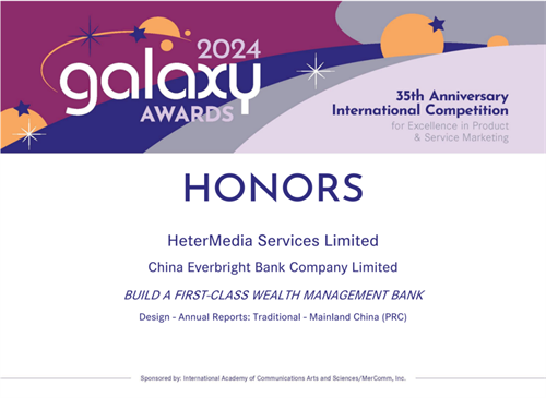此外,在国际独立评选机构MerComm, Inc.主办的Galaxy Awards年报大赛中,光大银行2023年年报荣获传统年报整体设计优异奖。Galaxy Awards评选自1987年开始,本次评选涵盖了来自全球80多个国家和地区的参选报告,依据其在信息传递方面的创意、效益、表现及成效等方面进行综合考量,最终评选出优秀获奖作品。