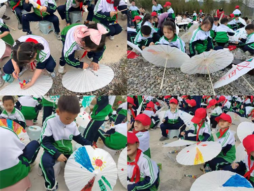 孩子们小小的身影沉浸在艺术创作的快乐之中,欢声笑语与颜料的色彩交织在一起,让每一把正在绘制的油纸伞都充满了童真与活力,仿佛即将展开一场奇妙的童话之旅。