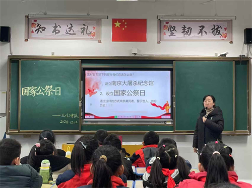 2024年12月13日,景德镇市第四小学开展了“国家公祭日”主题教育系列活动。通过升旗仪式、国旗下的讲话、默哀致敬、召开主题班队会等多种形式,让学生们明白了国家公祭日设立的意义,增强了同学们爱党、爱国的意识,激励孩子们铭记历史,不忘使命。(刘贞)