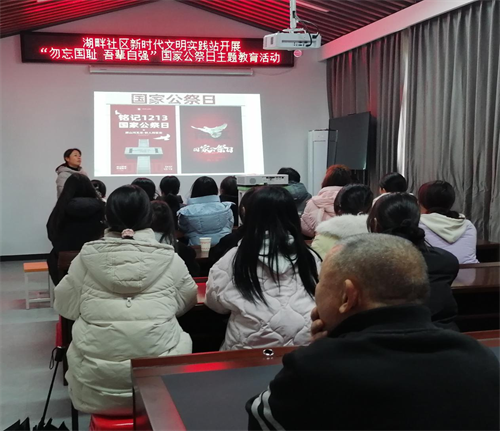 每年12月13日是南京大屠杀国家公祭日,在这一天到来之际,为了祭奠在南京大屠杀中遇难的同胞,深化爱国主义教育,12月10日下午,湖畔社区新时代文明实践站开展了“勿忘国耻 吾辈自强”国家公祭日主题教育活动,述往事,思来者,铭记历史,警钟长鸣!