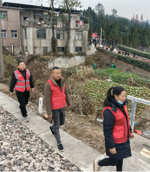 在鲇鱼山镇吕蒙公墓皖赣线K423+500处扫墓人员川流不息,每年冬至、清明祭祀的高峰期,每天流量达5000多人,由于部份村民会横跨铁路,存在重大安全隐患,鲇鱼山镇铁路护路巡逻队坚守岗位,加强铁路沿线巡逻防控工作。