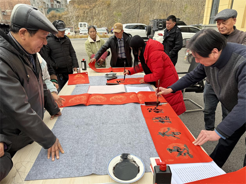 活动现场,伴随着墨香四溢,一张张字体各异的福字,一副副苍劲有力的春联呈现在大家眼前,“百花争艳春色无限好,万象更新江山分外娇”“春风春雨引万般春色,新岁新年开一代新篇”一句句寓意吉祥的新年祝福跃然纸上。精美的书法作品,吉祥喜气的祝福,为新春的到来增添了一笔浓浓的“年味”。春联虽小,情谊深远,每一副春联都承载着村民对美好生活的殷切向往。一副副充满喜庆、吉祥、祝福的对联传递到村民手中,不仅为他们送去了一份温暖,也是对中华传统文化的弘扬。