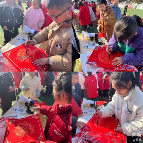 写福字区域墨香扑鼻,孩子们手执毛笔,一笔一划间流露出对新年的美好祈愿,一个个福字满载着童真与期盼。