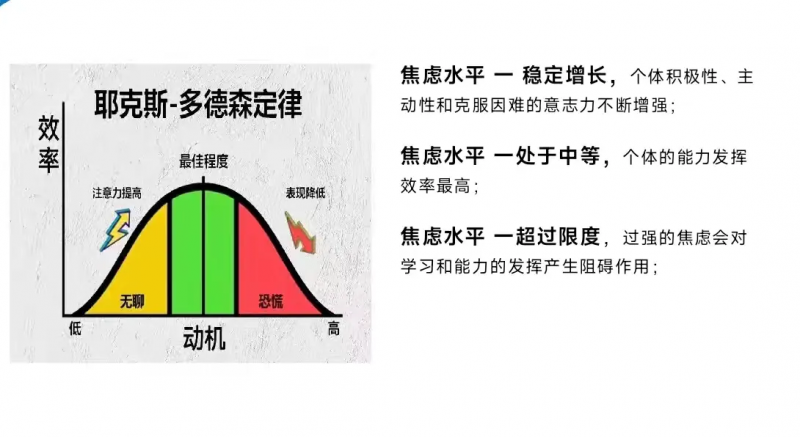 陈老师运用耶克斯多德森定律,向家长们阐述了如何帮助孩子调整学习状态。定律指 出,动机强度与工作效率之间的关系呈倒U 型曲线。因此,家长们在激励孩子时,应找到适当的动机水平,既不过度施压,也不放任自流。那就是放下结果、关注过程,营造好的亲子关系,以及关注孩子的情绪。