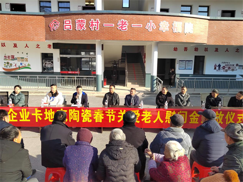 活动中,卡地克陶瓷有限公司总经理胡总说:“感谢吕蒙村党总支、吕蒙村委会对企业对帮助,尊敬、孝敬、关爱老人是中华民族的优良传统,我希望我们企业尽自己的努力献出自己的爱心,让这个吕蒙村更加和谐美好,祝大家新年快乐、万事如意。”随后,各村小组代表发表感言,预祝卡地克陶瓷有限公司业绩越来越好。