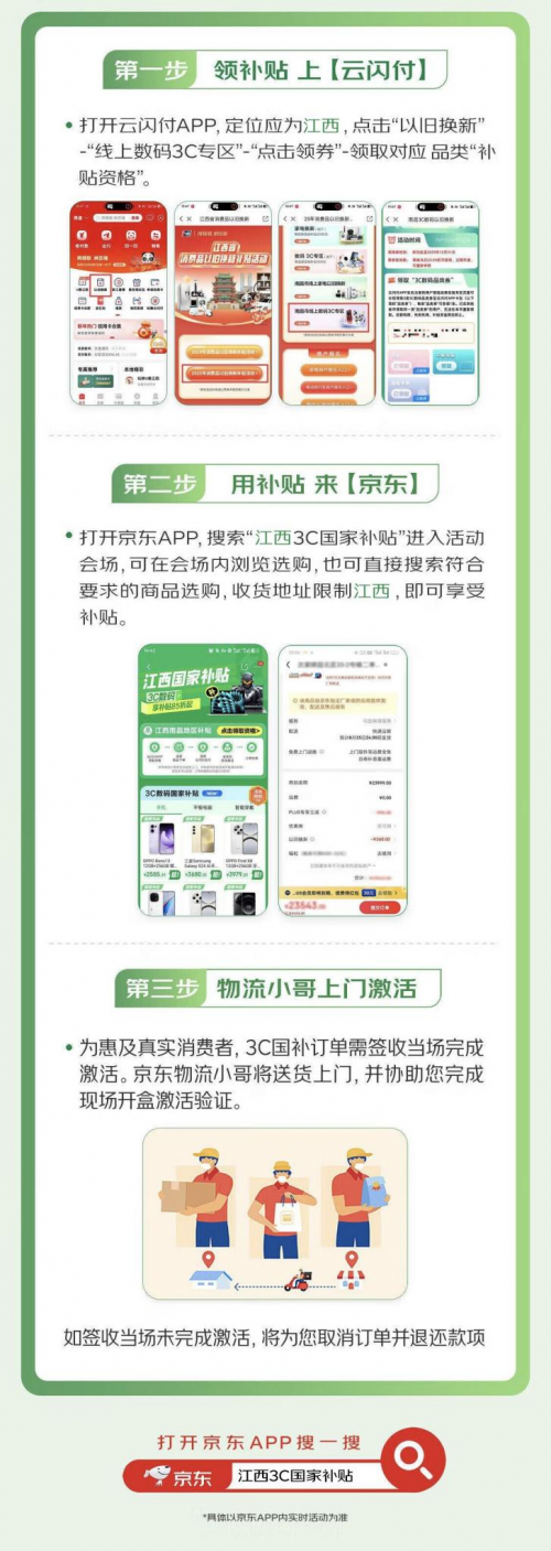 具体领取与使用流程为:定位在江西的消费者打开云闪付APP,点击“以旧换新”找到“线上数码3C专区”,点击领券,领取对应品类“补贴资格”。领取后,打开京东APP搜索“江西3C国家补贴”进入活动会场,可在会场内浏览选购,也可直接搜索符合要求的商品选购,收货地址在江西赣州、吉安,选择云闪付完成支付即可享受补贴。