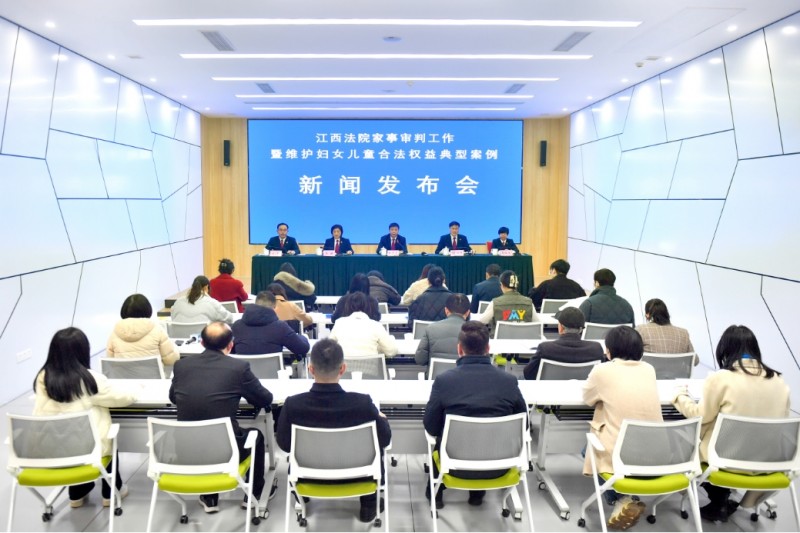 3月7日,江西省高级人民法院召开家事审判工作暨维护妇女儿童合法权益典型案例新闻发布会,省高院党组成员、副院长邹宇平、民一庭庭长李振峰,上饶市中级人民法院副院长廖健,党的二十大代表、贵溪市人民法院党组成员、泗沥人民法庭庭长周淑琴出席新闻发布会。新华社、中央广播电视总台、法治日报等十余家国家级和省级主流媒体记者参加了发布会。