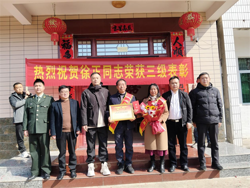 军人是国家的脊梁,军功章的荣耀不仅属于奋勇拼搏的军人,更属于那些默默奉献、倾力支持的军属。3月18日,区退役军人事务局副局长徐烈可、丽阳镇党委委员宁洲、镇退役军人服务站站长黎景华及丰田村党支部书记张英旺一行人,带着诚挚敬意,在阵阵锣鼓声中,为现役军官徐正的家属送去三级表彰喜报。