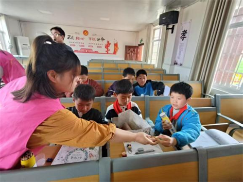 午后,教室变身“艺术工坊”。嫂子帮帮团将课桌拼成“创作岛”,孩子们以“我的家乡”为主题,用彩笔在画纸上描绘青山绿水、炊烟袅袅的乡村图景。10岁的张萌用黏土在画纸上捏出立体小房子,旁边写上“留阳村我的家”;另一组学生用树叶拼贴出稻田,童趣与乡情交融。游戏环节中,“成语接龙”“手影故事”在课桌间展开,欢声笑语不断。