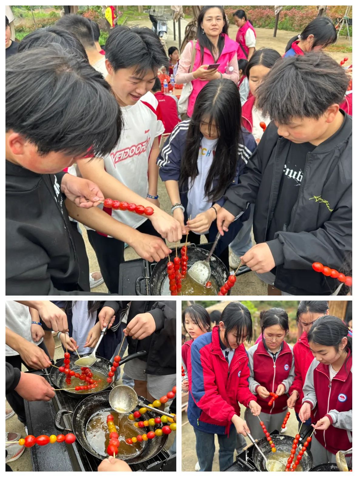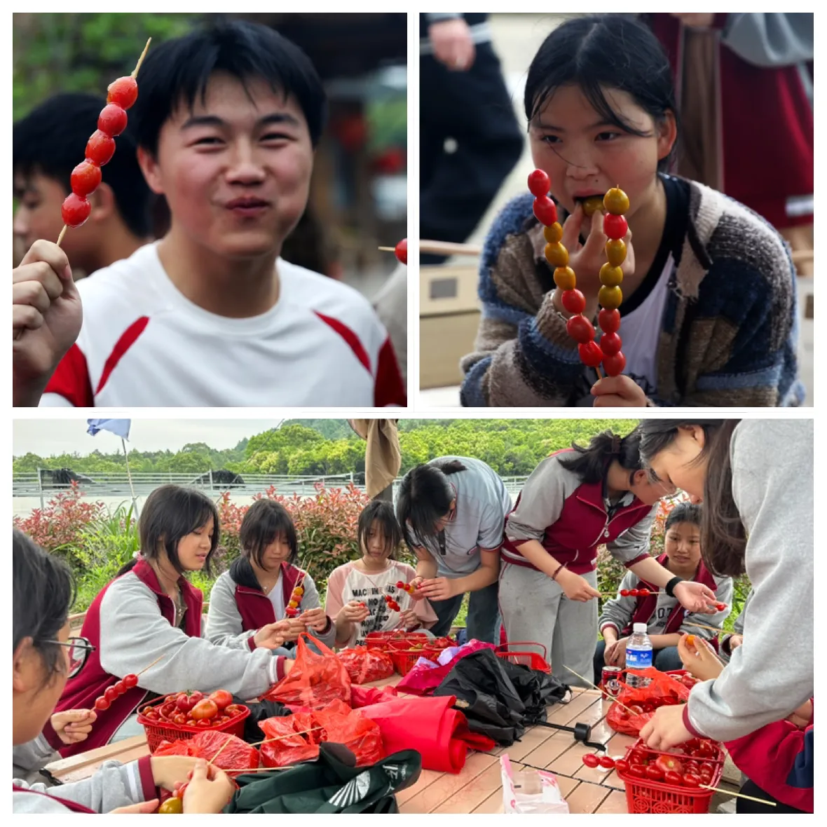 同学们忙碌着将刚采摘的小番茄串成糖葫芦,糖浆在火上慢慢熬化,滴落在串串小番茄上,晶莹剔透。糖葫芦香甜可口,同学们品尝着自己的劳动成果,脸上洋溢着满足的笑容。