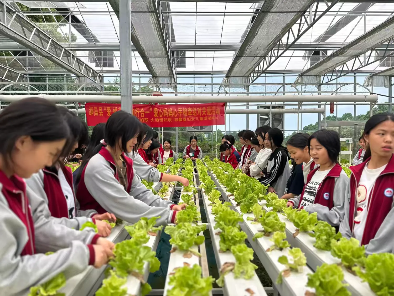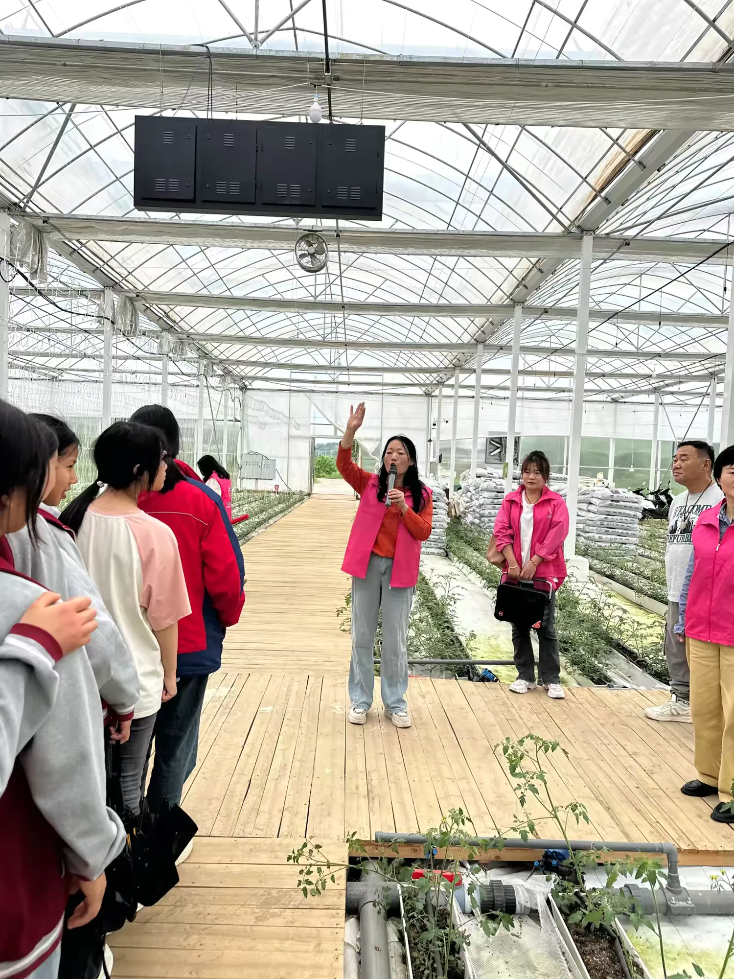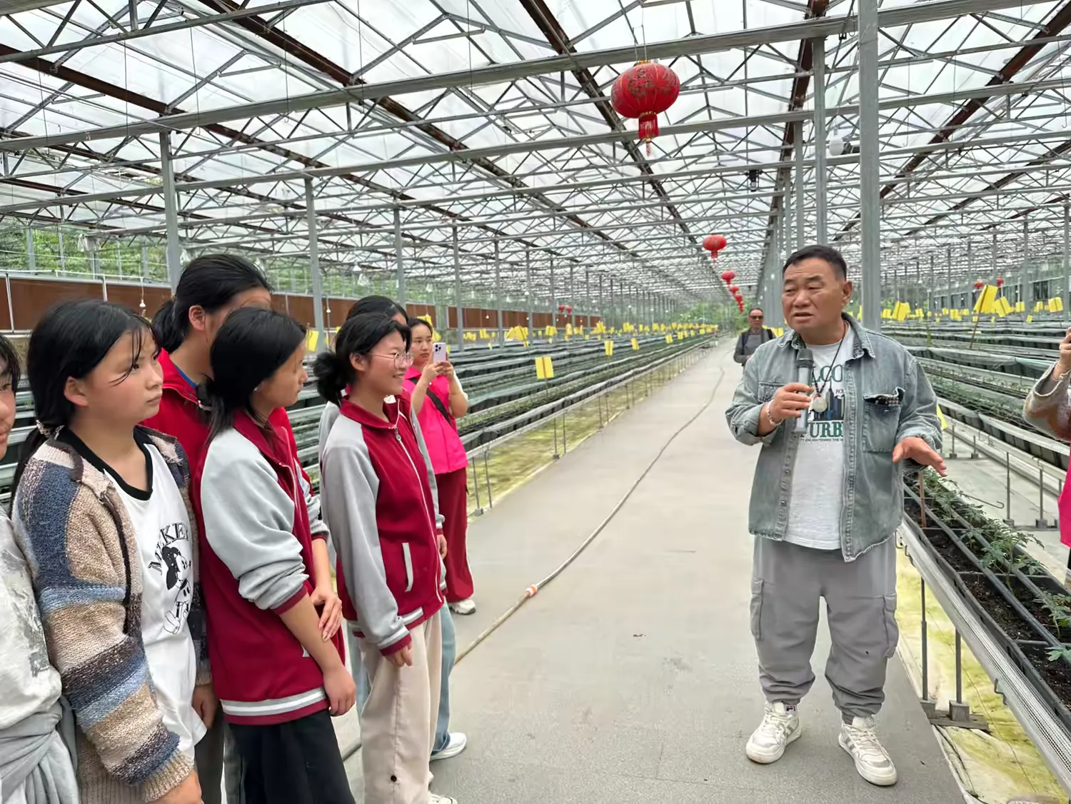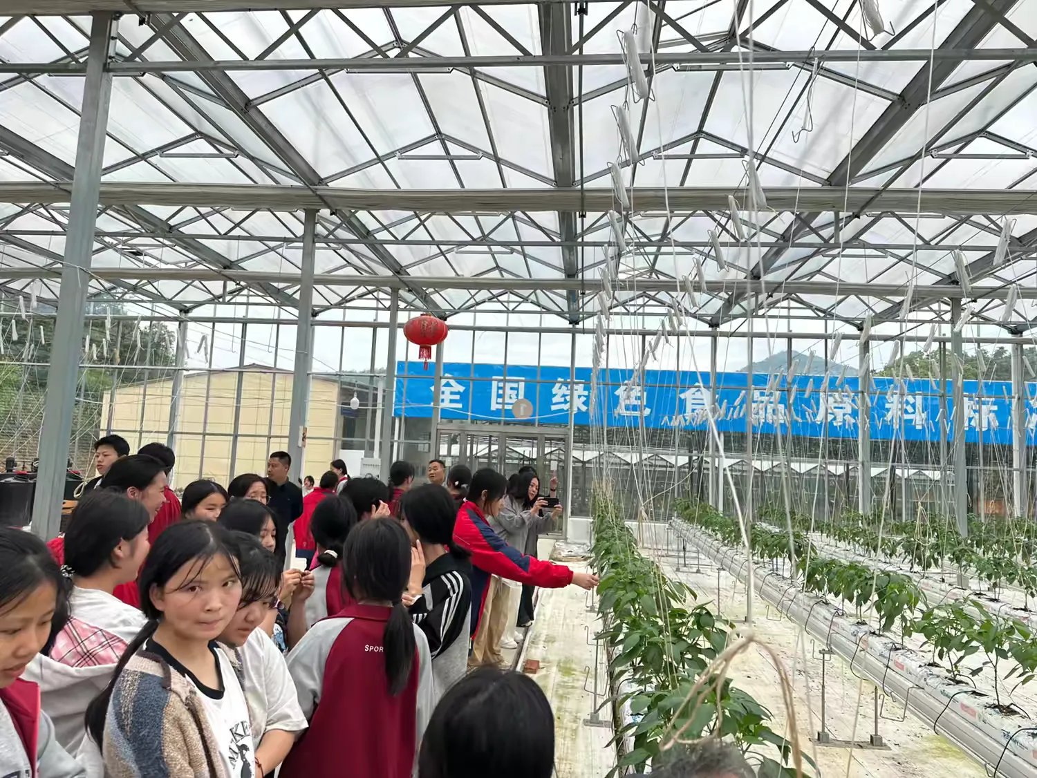 在基地技术人员的引导下,师生们通过聆听工作人员现场讲解,了解了智慧农业种植模式。随后,在蔬菜大棚,基地讲解员向同学们详细介绍了蔬菜的品种、生长习性以及现代栽培技术。大棚里生气勃勃的蔬菜也让学生们亲身感受到了绿色农业的活力,体会了硕果累累的幸福感。