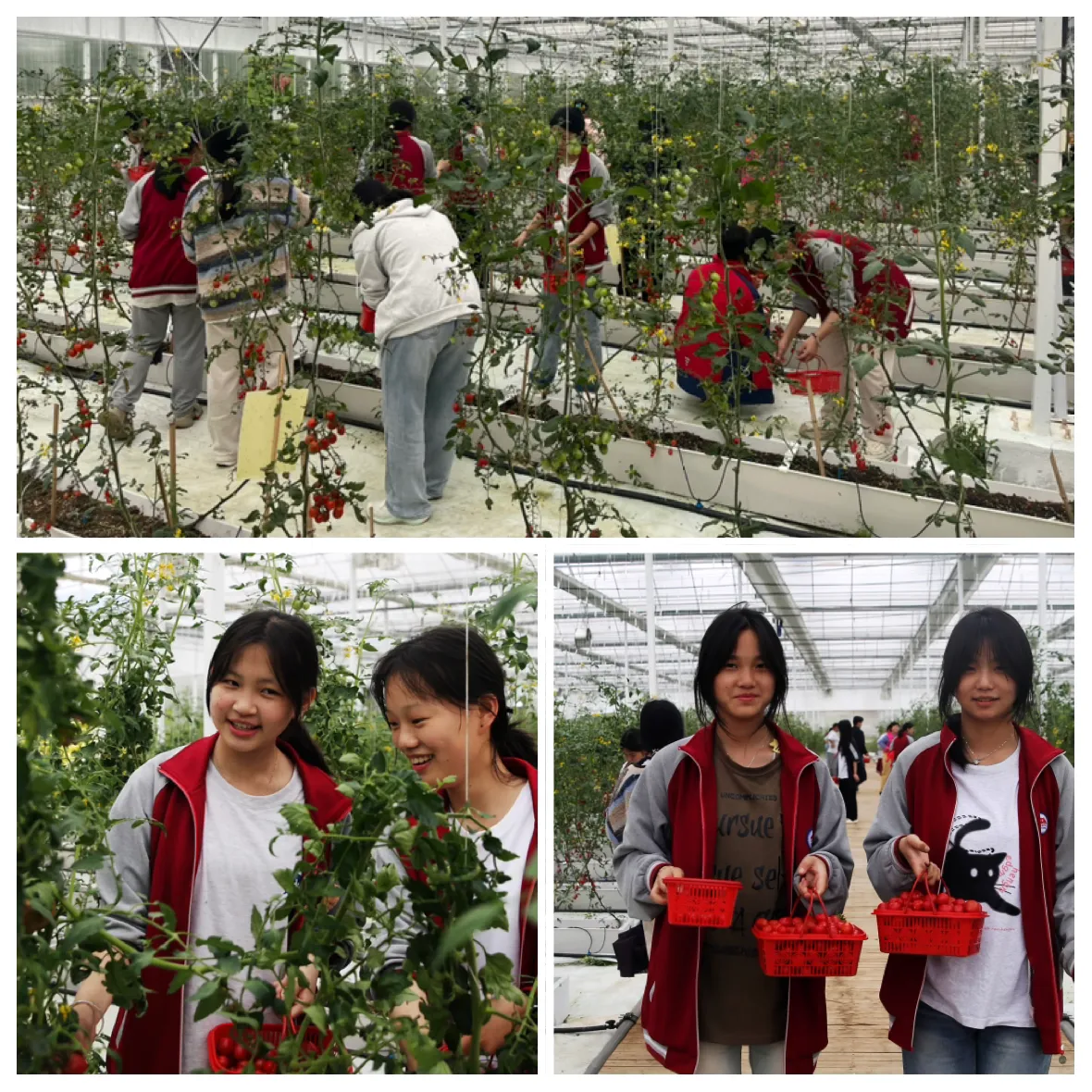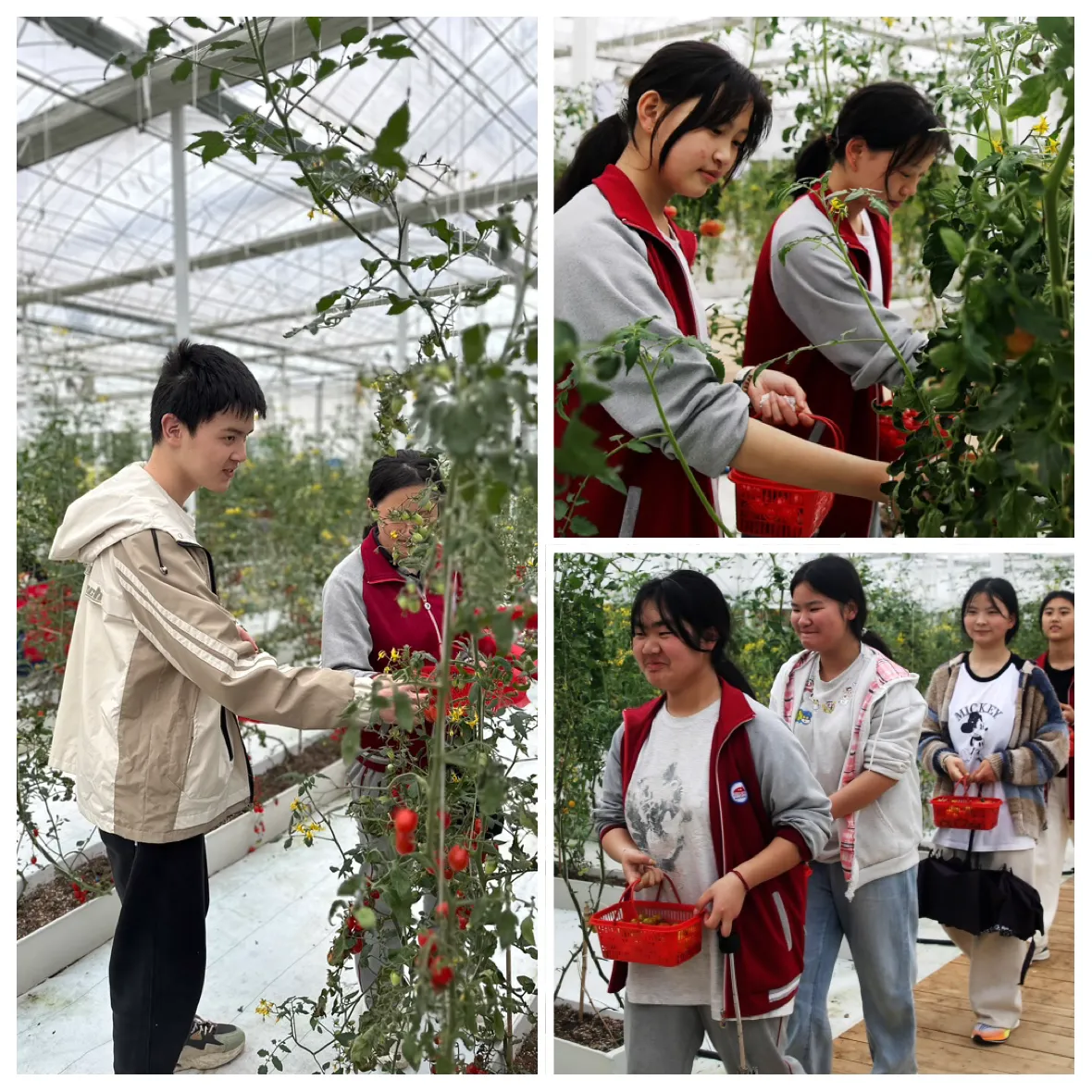 到达番茄智慧生产区,学生们边参观边听讲解员介绍。种植棚里散发着水果的清香,学生们迫不及待的奔向番茄一起采摘起来。学生们小心翼翼地把小番茄采摘下来,他们穿梭在青藤绿叶间,寻找心仪的小番茄。学生们通过采摘不仅体验到了收获的快乐,更品尝到了甜蜜的劳动成果。