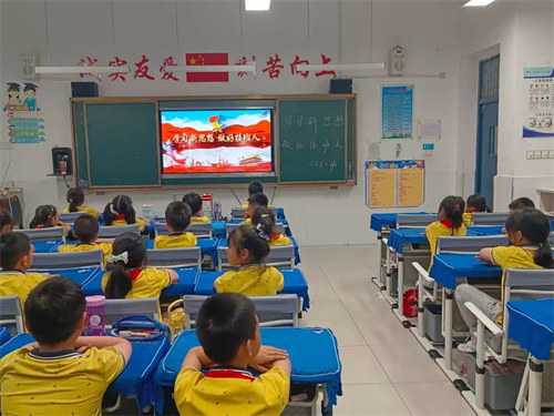 在主题班会的互动环节中,同学们积极举手发言,分享自己对于如何践行新思想的理解和计划。有的同学表示要努力学习科学文化知识,将来为国家贡献自己的力量;有的则提到要从身边的小事做起,如节约用水、爱护公物等。教室里充满了热烈的讨论氛围,大家共同描绘了属于自己的理想蓝图,立志成为合格的社会主义接班人。