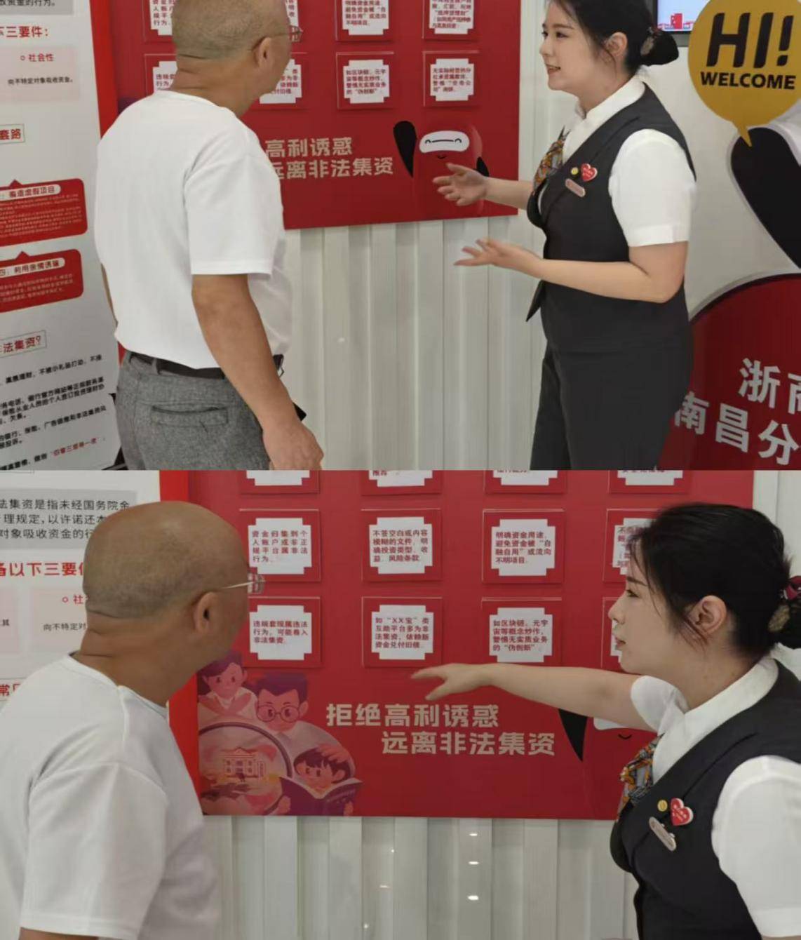 以银行网点为宣传主阵地,在营业厅显著位置张贴防范非法集资宣传海报,摆放宣传折页、手册;利用LED显示屏滚动播放宣传标语、警示案例,电视屏循环播放防范非法集资科普视频;厅堂设立“防范非法集资综合金融服务站”,现场普及有关防范非法集资危害知识,讲述非法集资警示案例;同时在柜台设置宣传咨询台,安排专人解答客户疑问,实现网点宣传常态化、全覆盖。