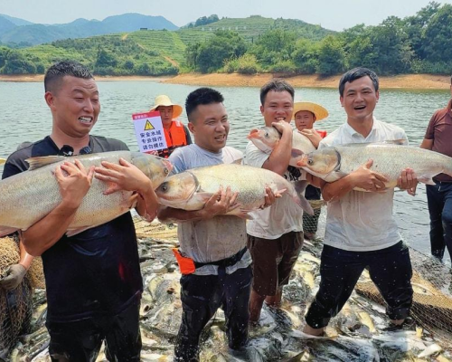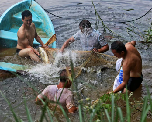 直播当天,塘边架起了简陋的设备。文敏帅气阳光的外形,配上幽默的俚言俗语,再加上新鲜光滑的大草鱼,直播间瞬间涌入大量观众。村干部们全都披挂上阵,推三轮车、开私家车,挨家挨户送鱼。