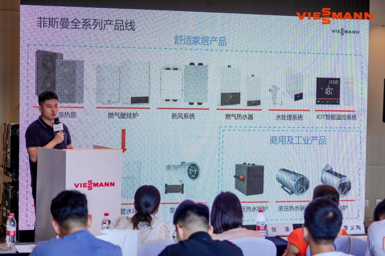 在产品技术解析环节,菲斯曼热泵技术工程师和售前技术工程师们,深度剖析了今年上市的菲斯曼重磅新品——一体式高能效空气源热泵Vitocal 100-A CN (S)。该产品依托菲斯曼近50年热泵研发经验及开利集团技术优势,完美契合中国“双碳”战略需求:超低温运行模式确保南北气候适应性,±0.5℃精准温控搭配智能除湿、自清洁功能,为用户营造四季舒适环境;更支持与壁挂炉组成双源混合系统,通过云端智能算法实现热源无缝切换,能效超越新国标一级标准16%,尽显“环保先锋”实力。