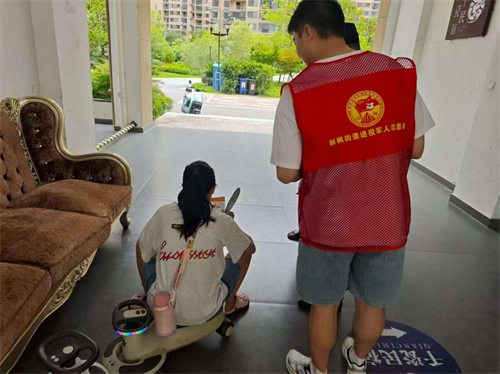 活动现场,两名身穿标识马甲的工作人员成为焦点:红色志愿者背心上印有“新枫街道退役军人志愿者”字样,蓝色马甲搭配白色T恤的组合则彰显专业与亲和力。他们手持宣传册,主动向过往居民、商铺经营者及青年群体讲解征兵政策。在小区广场的折叠桌旁,宣传人员与一名坐在儿童扭扭车上的居民亲切交流,对方正认真阅读手中的《大学生应征入伍优惠政策手册》。背景中,烟酒店的玻璃门与户外绿植形成鲜明对比,展现出社区宣传与日常生活场景的深度融合。