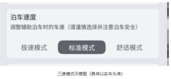 三速泊车适用于天神之眼B、天神之眼A平台,三速泊车通过天神之眼的超强感知能力,在满足安全的前提下给予用户更多的自主选择权。用户可以自主选择“舒适”“标准”和“极速”三种泊车速度。舒适模式下,泊车速度最高可达2-3km/h,标准模式下最高可达3-4km/h,极速模式下最高可达4-5km/h。泊车辅助(联动后轮转向)适用于天神之眼B平台,在泊车过程中,会结合后轮转向能力,减少泊车揉库次数,提升泊车辅助效率。