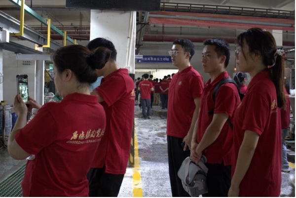 7月1日,团队成员深入景德镇乐华陶瓷洁具有限公司,实地探寻陶瓷产业在绿色创新、智能制造、循环经济领域的转型升级实践。团队成员们围在设备旁,仔细观察着每一个操作步骤,以细致入微的态度详细了解各生产环节的创新举措与发展成果。考察过程中,带队老师创新教育模式,巧妙地将思政课堂“搬”至产业前沿阵地,通过实地观察生产场景、与企业技术人员深入交流等方式,引导学生深刻认识科技创新对推动产业升级的核心作用,真切领悟绿色发展理念在陶瓷制造中的具体实践路径。