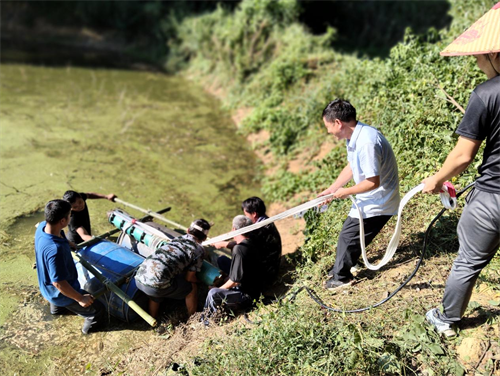 由于稻田距昌江河2公里之遥且有山相隔,直接抽取昌江河水至稻田难以实现。村党支部经实地勘察,果断制定三级提灌方案:首级从昌江河抽水至千米外山边水沟;二级用两台水泵经四百余米管道将水注入山中干塘蓄积;三级再从塘中抽水,通过近七百米管道最终将水送入稻田。