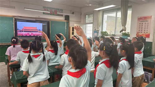 上午9时许,各班级教室早已布置妥当,电子屏幕清晰播放着阅兵直播画面。当激昂的国歌奏响,镜头里五星红旗冉冉升起时,全体师生自发起立,面向屏幕肃立行注目礼,嘹亮的歌声在教室里回荡,爱国之情在每个人心中激荡。