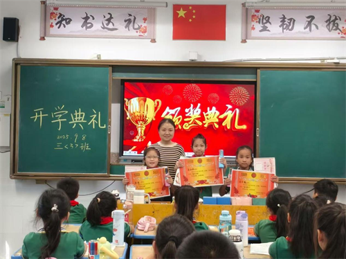 在开学典礼上,各班班主任为本班上学期表现优异和在“纪念抗战胜利日80周年”书画活动中获奖的同学颁奖。