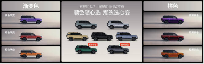 为了让广大用户选得尽兴,钛7直接一步到位,带来了7款外观颜色、3款内饰颜色,同步在官方商城上架了6款潮改方案,可满足不同用户的审美偏好。