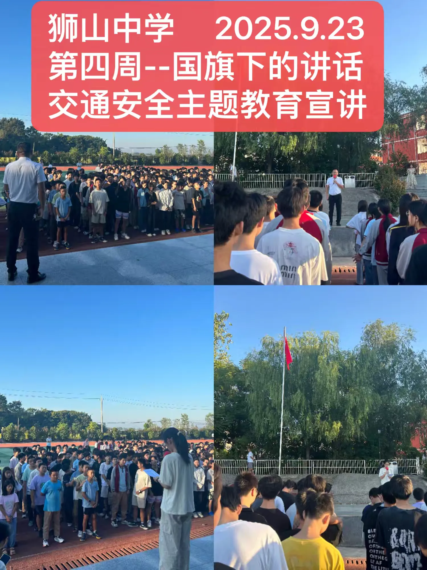 “居安思危,思则有备,有备无患。”安全是做好一切工作的前提。大家都知道,车辆在给我们带来便利的同时,也会给我们带来巨大的伤害,为了加强学生的安全意识,强化学生的交通规则意识,提高学校的应急处置能力,筑牢校园交通安全这道“防火墙”,打造“平安校园”。9月23日,狮山乡中学开展了交通安全教育国旗下讲话。