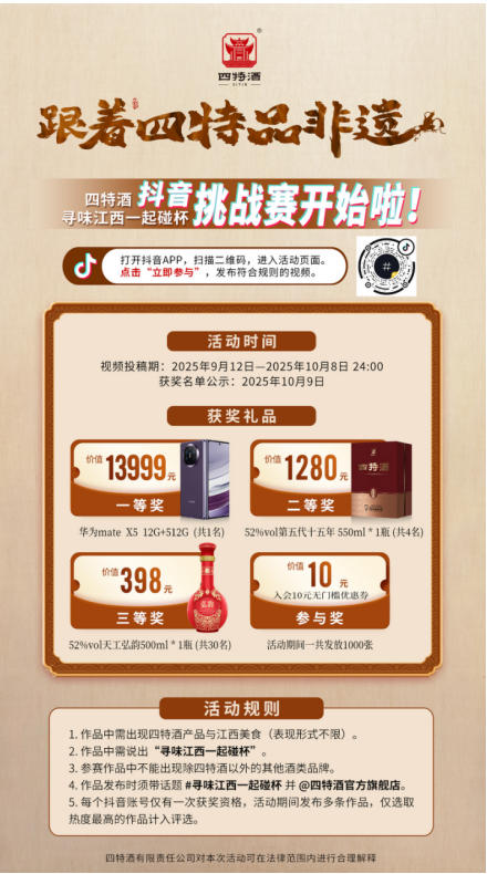 从达人非遗寻味,到全民参与的抖音挑战赛,再到福利满满的直播专场,四特酒以创新形式为江西非遗文化注入新活力 —— 它打破了非遗 “遥不可及” 的刻板印象,让非遗美食成为可品尝的日常。这场非遗寻味行动,不仅是一次美食美酒与文化的双重盛宴,更是一次对江西非遗文化的传承与溯源。拿起你的手机,用你的镜头、你的创意、你的味蕾,拍下你生活中关于非遗美食、非遗美酒的美好一刻,将视频在抖音端带话题#寻味江西一起碰杯#发布,记录生活瞬间的同时,为家乡美食打call。参与抖音挑战赛互动,即有机会赢得万元手机大礼,更能让世界通过赣鄱美食、赣鄱美酒认识江西,品味江西,爱上江西。(抖音搜索#寻味江西一起碰杯#话题,点击立即参与,即可参加本次抖音挑战赛活动,有机会赢得万元手机大礼。)
