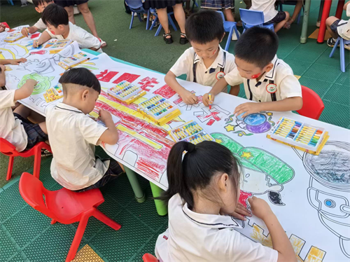 经过近一个小时的创作,原本空白的画布变成了一幅色彩斑斓、充满童趣的“爱国画卷”。孩子们拉着画卷的两端,兴奋地展示着自己的作品,脸上洋溢着自豪的笑容。此次活动不仅让孩子们在动手实践中体验了创作的快乐,更让爱国的种子在幼小的心灵中悄然扎根。