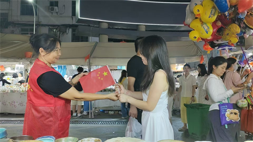 夜色正好,风清气爽,在国庆节来临之际,新厂村陶阳新村开展“喜迎国庆 国旗传情”主题活动,为辖区商户、过往游客免费发放小国旗,用一抹抹“中国红”点燃节日氛围。