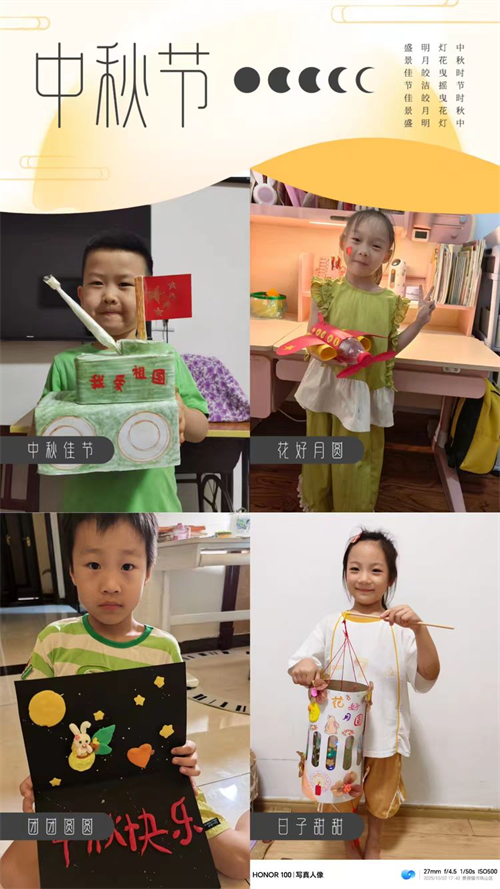 在这个温馨的中秋佳节,孩子们用他们的小手,为我们带来了一场别开生面的创意之旅。他们凭借着无限的创意和细致入微的匠心,巧手制作出了一件件关于中秋的精巧绝伦的艺术品。他们用心挑选材料,耐心雕琢细节,每一件作品都蕴含着满满的热情和不懈的努力,展现出非凡的创造力和手工艺技能。