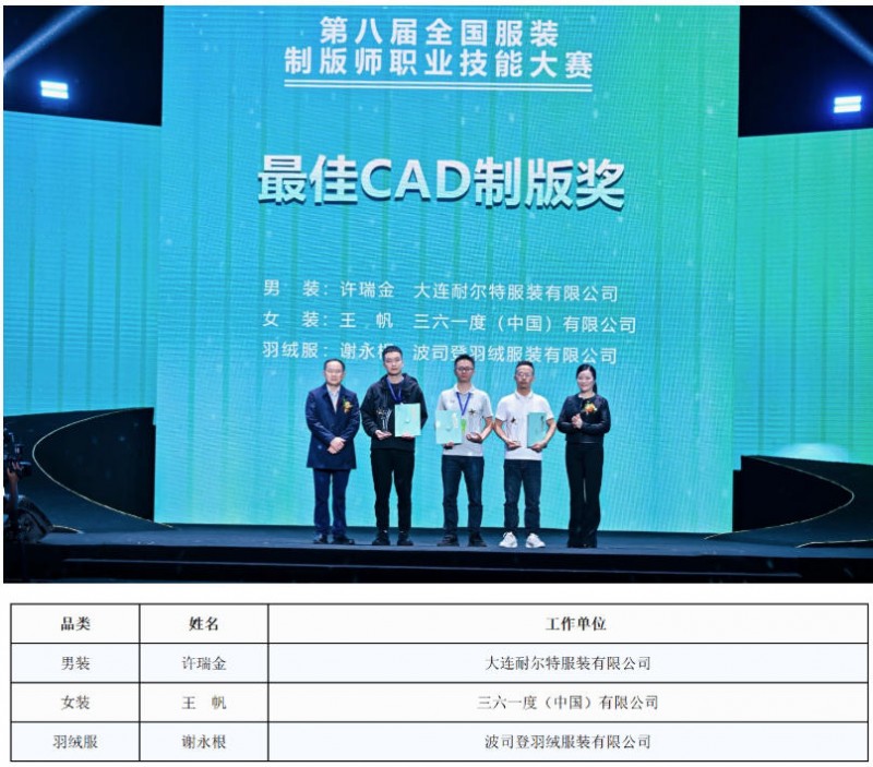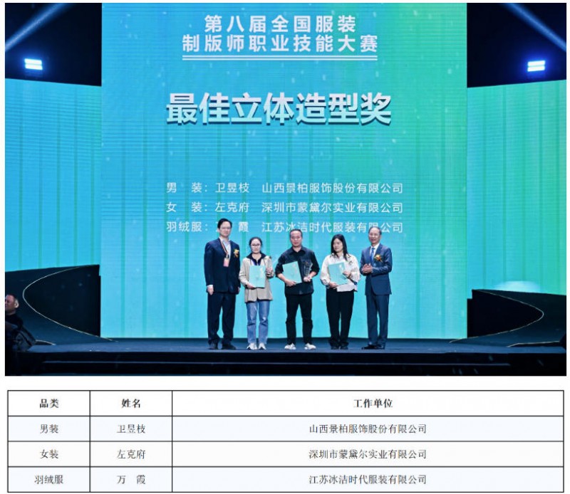 经过多日的严格考核,最终,万刚群、王帆、刘亚兵、左克府、袁超、陆由青、刘盛涛、金运曙、余真平、朱东伟获得“全国十佳制版师”荣誉称号;许瑞金、王帆、谢永根获得“最佳CAD制版奖”;卫昱枝、左克府、万霞获得“最佳立体造型奖”;金运曙、邓少明、万刚群获得“最佳制作工艺奖”;刘明、洪永桂、杜军营、张龙炎、张世杰、查兴兴等人获得“优秀奖”。荣誉加冕,实力认证,他们收获了属于自己的掌声与荣耀。