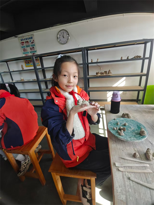 理论知识的铺垫之后,便是最令人期待的动手环节。在工作台前,孩子们系上小围裙,挽起袖子,迫不及待地投入到创作中。拉坯区,一双双沾满泥浆的小手在转盘上小心翼翼地摸索,原本不成形的泥团,在旋转中渐渐“生长”出碗、杯、瓶的雏形。虽然作品歪歪扭扭,但每个孩子脸上都写满了专注与兴奋。