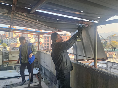 12月6日上午,新枫路社区接到浮景宿舍张女士的反映,称其所在楼栋顶楼雨棚破损严重,一块铁皮摇摇欲坠,存在极大安全隐患。群众安危无小事,社区工作人员在收到诉求后高度重视,于当日下午第一时间赶赴现场查看实际情况。