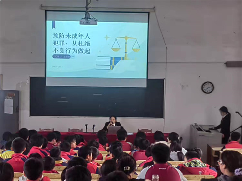讲座在庄严而热烈的氛围中拉开帷幕。投影屏幕上,“预防未成年人犯罪:从杜绝不良行为做起”的主题醒目呈现,讲台前,王校长依托多媒体设备展开深入浅出的讲解,学生们专注聆听,认真记录,展现出强烈的求知热情和良好的纪律风貌。