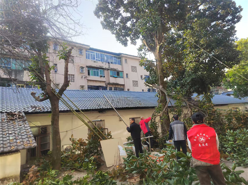 昌江区宿舍居民反映家门口树木近年来因根系老化、遭遇风雨侵蚀,树干逐渐向居民楼方向倾斜,有安全隐患。了解情况后,社区工作人员第一时间到现场实地查看,并走访了周边居民,小区树木遮挡采光、通风,加上枝干和根系的侵入,对小区老旧围墙造成威胁,如遇极端的大风雷雨天气,会严重影响居民的日常生活和人身安全。为彻底解决问题,社区广泛征求居民意见,积极对接有关部门,请专业人员进行修整砍伐,同时,社区志愿者们协调施工期间的停车、通行等事宜,争取居民全力配合。