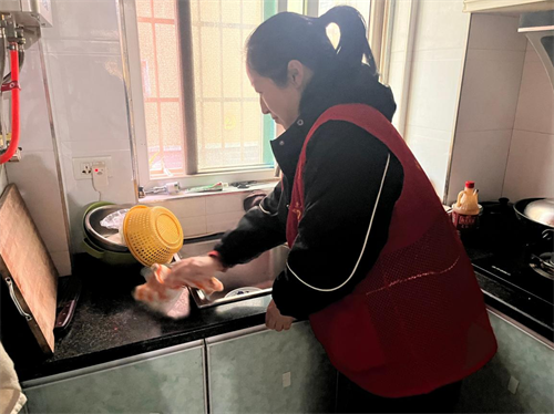 在程大毛家中,志愿者们不仅将厨房油污彻底清理,还按照 “方便取用” 的原则重新摆放厨具,并用标签注明物品名称。“这样他找东西就方便多了。” 志愿者特意将常用物品放在低矮的橱柜里,还教会程大毛简单的整理方法。