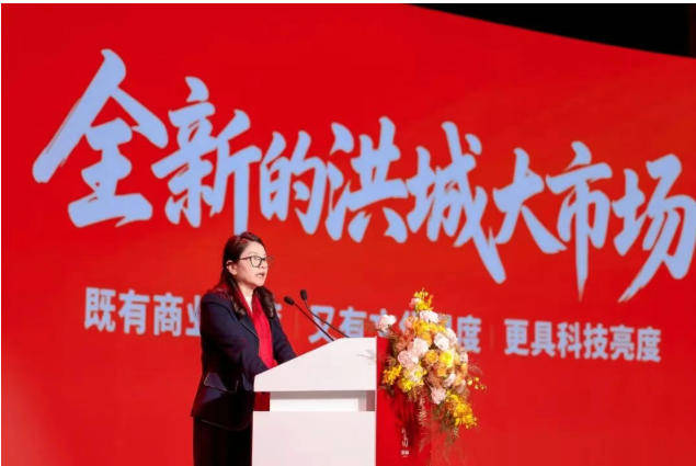 活动的下半场,洪大集团总经理龚小萍登台,进一步分享了新洪城大市场未来发展的战略蓝图。她指出,新市场的崛起不仅是物理空间的迁移,更是一场以数字化为“动力引擎”、从“传统卖场”向“未来商业新地标”的华丽蜕变。未来的核心,是通过全力推动“商文旅、批零、线上线下、产供销、内外贸”五大融合,推动市场从单纯的交易场所,彻底转变为融合消费、体验、文化与生活的综合平台,完成一场关于商业本质的深刻质变。