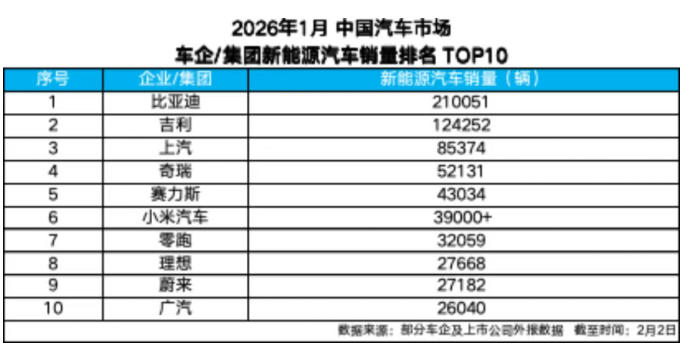 新年伊始,中国新能源汽车市场的竞争轮廓迅速显现,头部车企之间的差距在1月销量榜单中被进一步拉开。截至2月2日,根据部分车企及上市公司对外披露的数据,比亚迪以超21万辆的新能源汽车销量位居行业首位,展现出极具强大的市场竞争力,继续稳居中国新能源市场头部位置,并在主要车企中拉开明显差距。