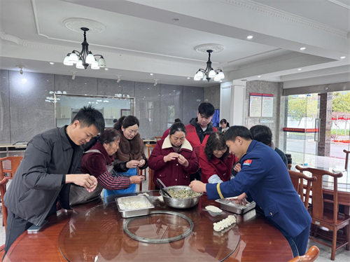 活动现场暖意融融,消防救援人员与居民们围坐一堂,分工协作擀面、调馅、包饺子,欢声笑语间,一个个饱满的饺子摆满托盘。另一边的灯谜区热闹非凡,涵盖消防安全、民俗知识的趣味谜面,让居民在解谜中轻松学习安全常识。大家凭猜谜、包饺子积攒的积分,兑换到实用的生活用品,成就感满满。