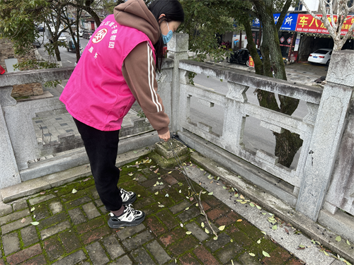 活动现场,身着粉色志愿马甲的志愿者手持垃圾夹、扫帚等工具,沿着辖区步道、绿化带、石栏周边细致清理,重点捡拾路面烟头、纸屑、落叶及隐藏在角落的杂物。大家弯腰俯身、分工协作,不放过一处卫生死角,不遗漏一片零散垃圾,耐心细致地将步道缝隙、石栏下方的枯枝落叶逐一清理干净。