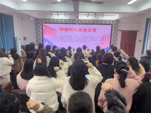 学校工会主席杨冰带领全体教师庄严宣誓,誓言铿锵、掷地有声,充分展现了四小教师恪守师德、潜心育人、爱岗敬业、无私奉献的坚定信念与责任担当。