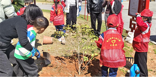 种植现场一派热火朝天的劳动景象。大家分工协作,挥锹挖坑、扶苗培土、提水浇灌,每一个环节都认真细致。孩子们也拿起小铲子,在老师的指导下亲手种下属于自己的小树苗。经过一个多小时的共同努力,数十株新栽的树苗迎风挺立,为小区增添了勃勃生机。