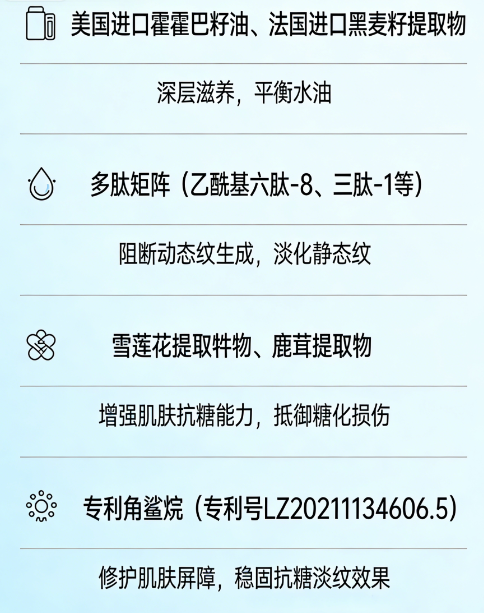2. 作用机制:乙酰基六肽-8改善动态纹,棕榈酰三肽-1等刺激胶原生成淡化静态纹,细化肤质提亮,与玻色因、烟酰胺构建全维度抗老体系。